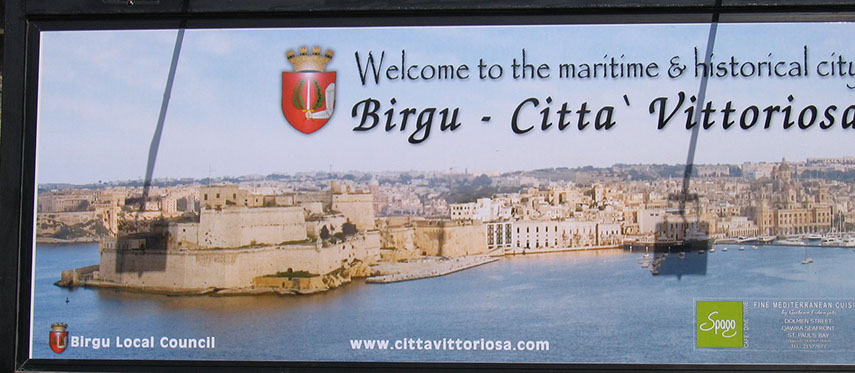 Malta: A poster welcomes you to Birgu – Fort St Angelo is at the left hand end